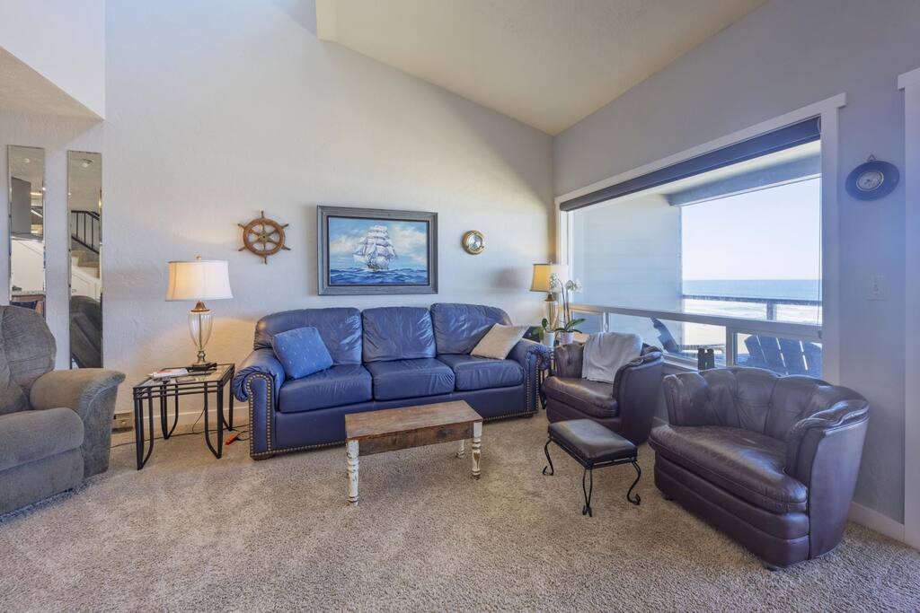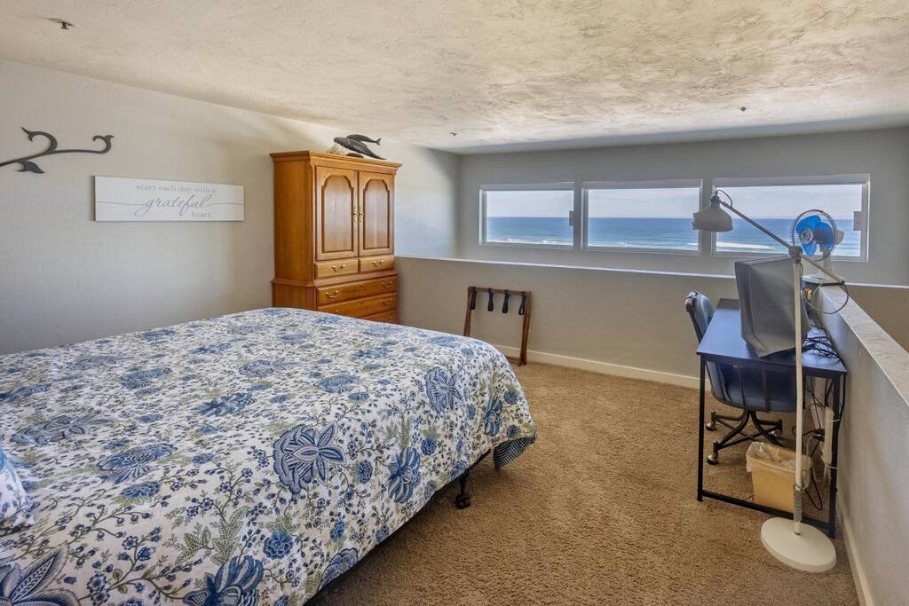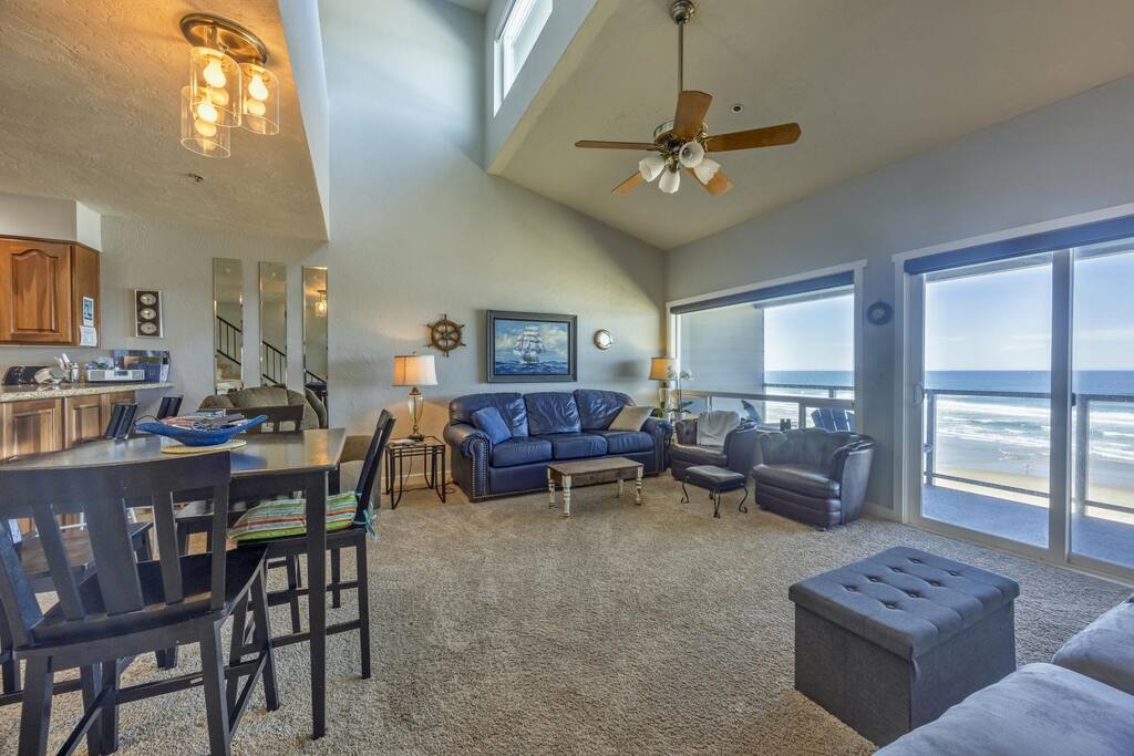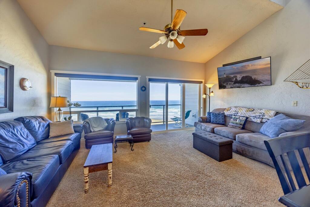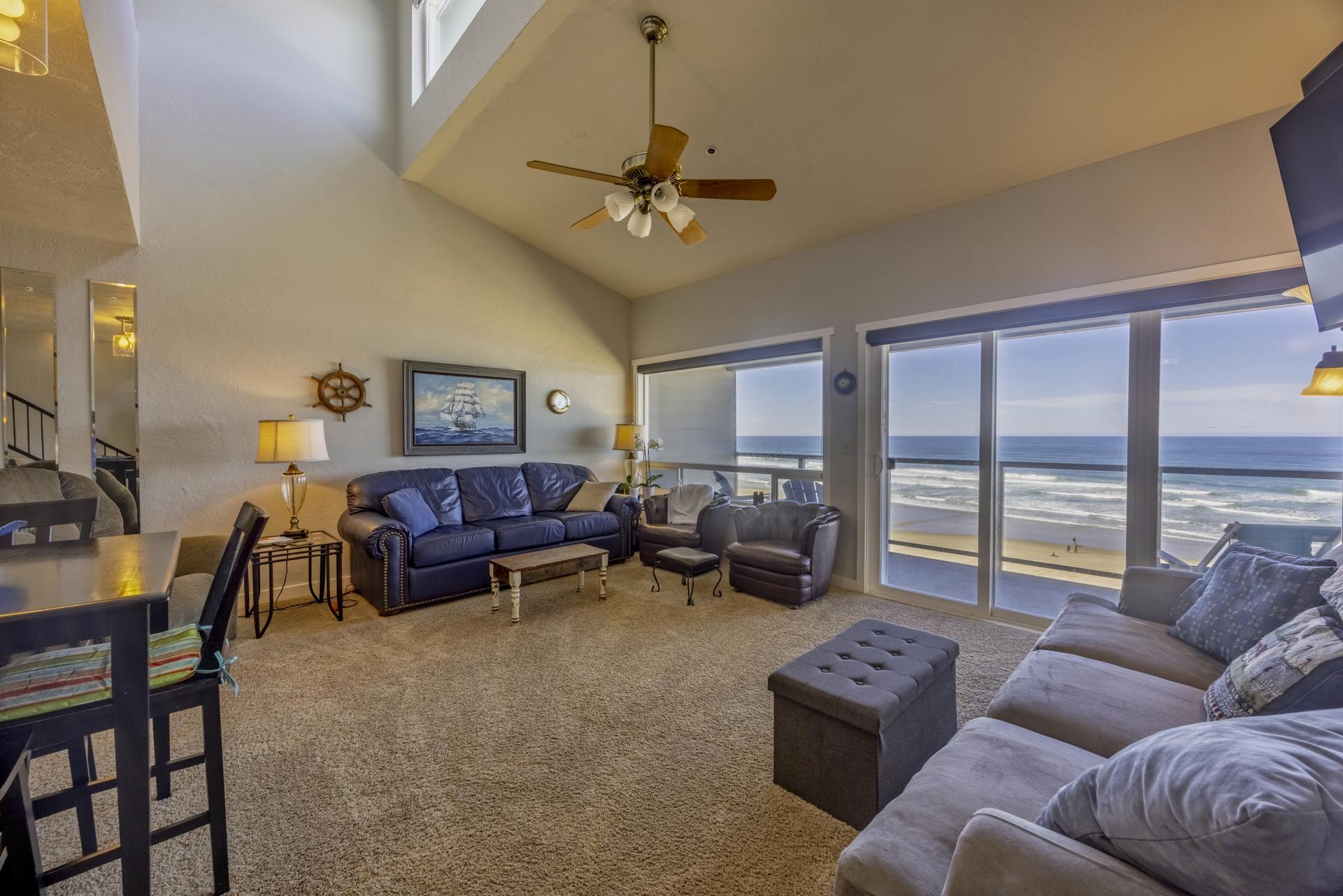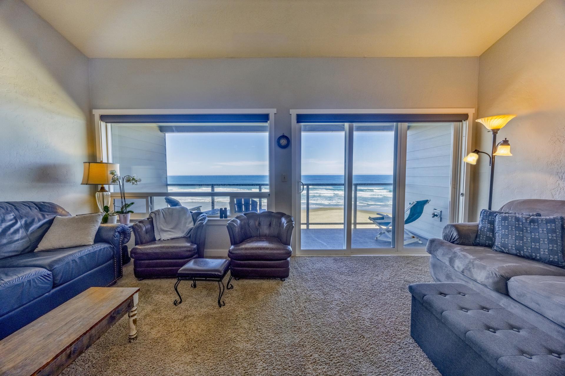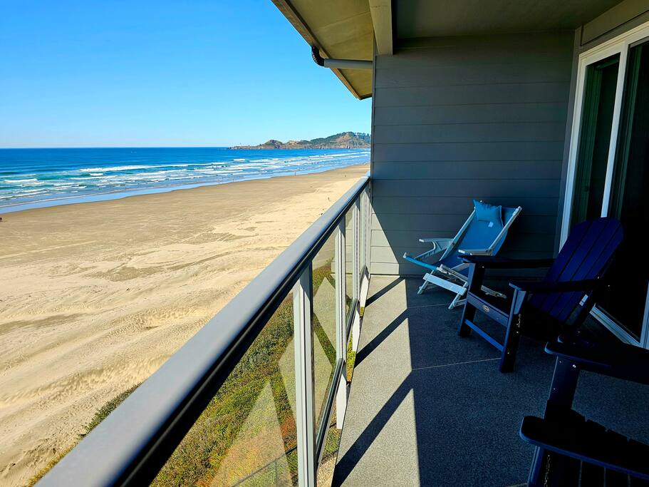 Beautifully remodeled, top-floor condo sits directly on the sand, offering panoramic views of Nye Beach, Yaquina Head Lighthouse, & miles of sparkling coastline. Perfect for a romantic escape or a fun family beach retreat, this affordable gem combines comfort, style & unbeatable views. * 2 King Bedrooms (1 king: could be split into 2 twins upon request) * Jacuzzi Tub for two * Full Kitchen * Games & DVDs * Baby Gear * Roku TV + Wi-Fi * Floor-to-ceiling views * 2 Bathrooms * Easy Checkout