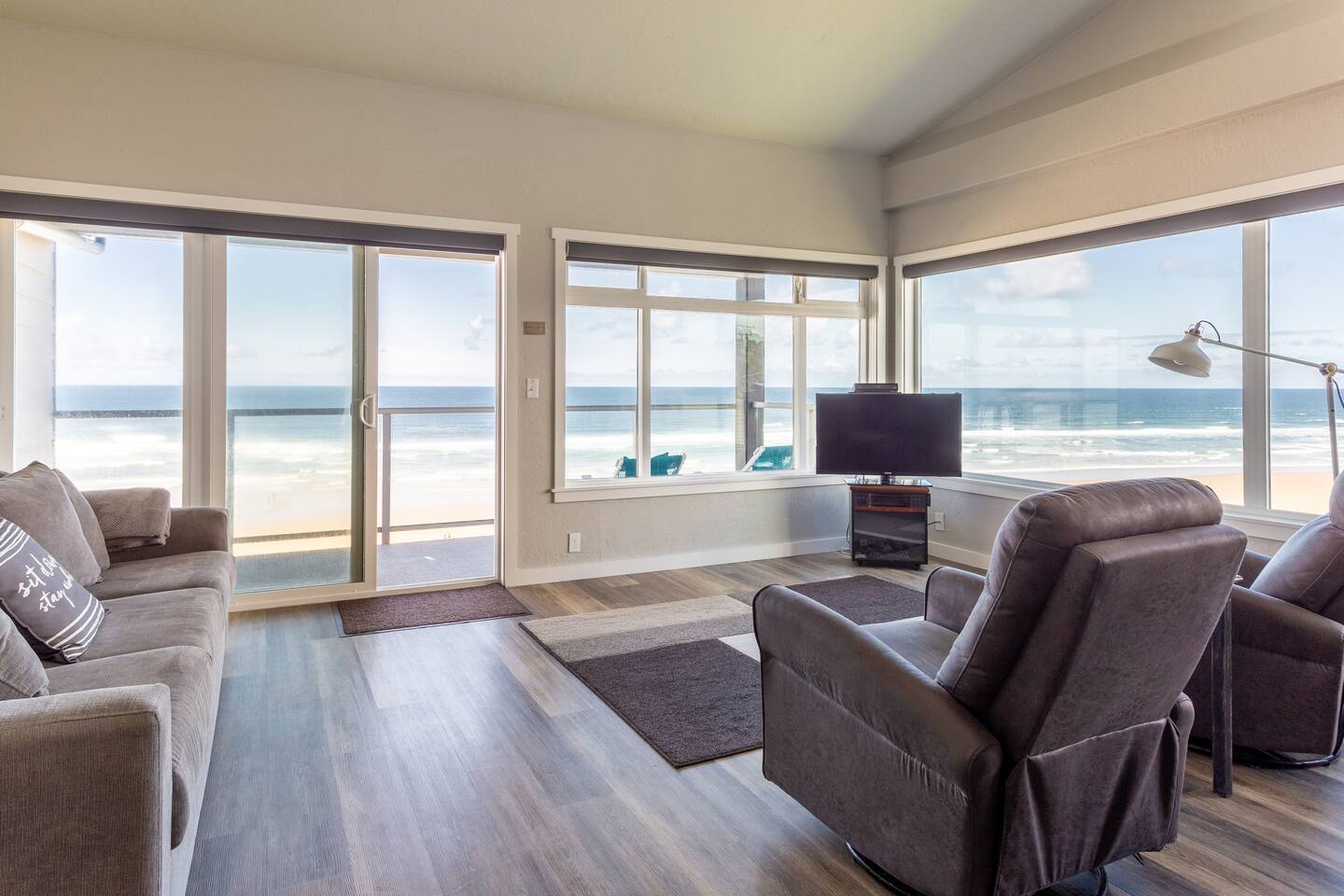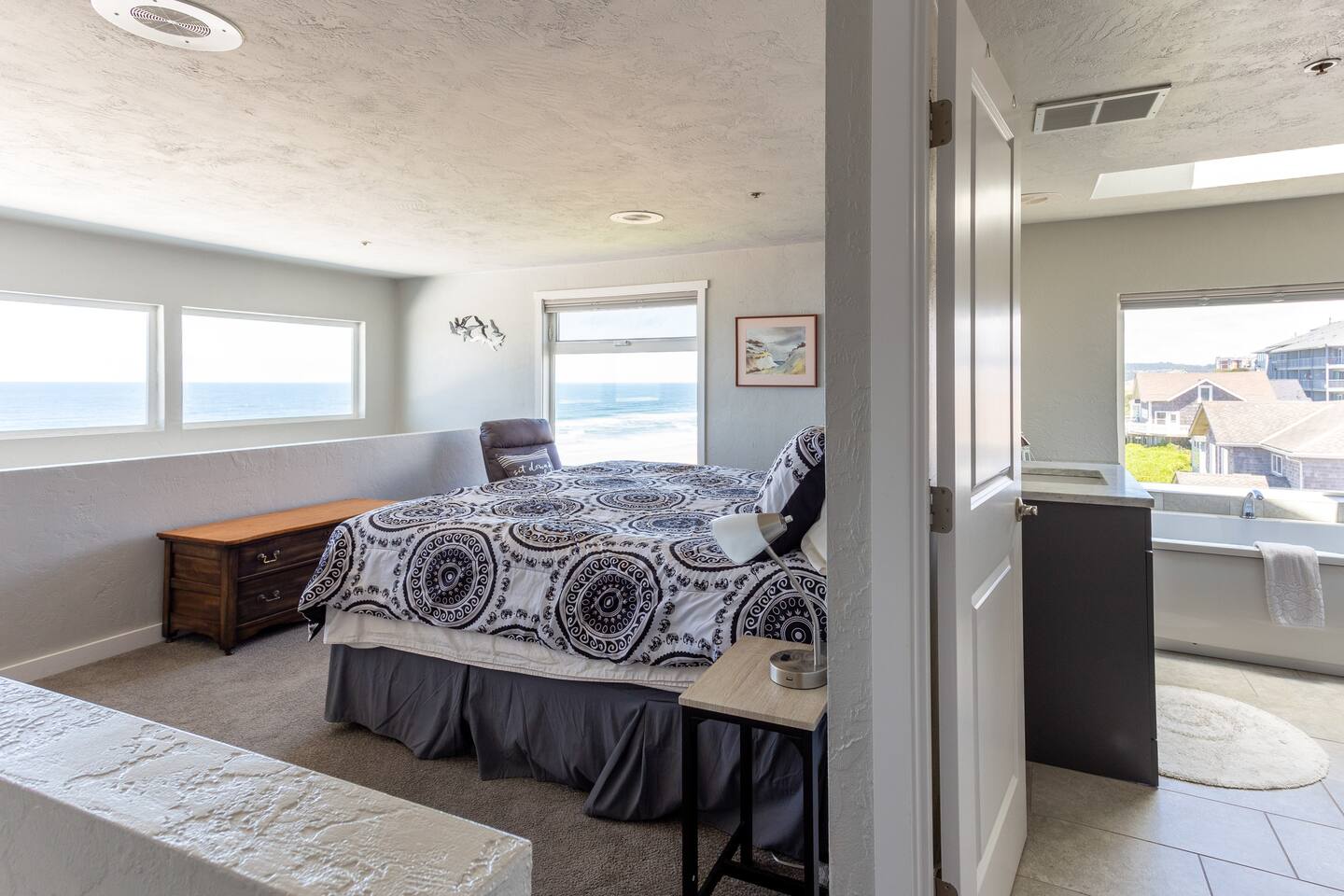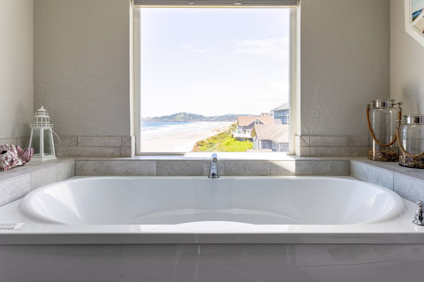 Perched on the top floor at the corner of the building, this oceanfront condo offers breathtaking views of Nye Beach, Yaquina Head Lighthouse, and the shimmering sea — the perfect setting for a romantic seaside retreat. • 2 King Bedrooms • Ocean-view jacuzzi tub – unwind in style • Fully equipped kitchen • Games & DVDs for cozy nights • Baby gear included • Roku TV + Wi-Fi • Floor-to-ceiling views • 2 bathrooms • Easy checkout