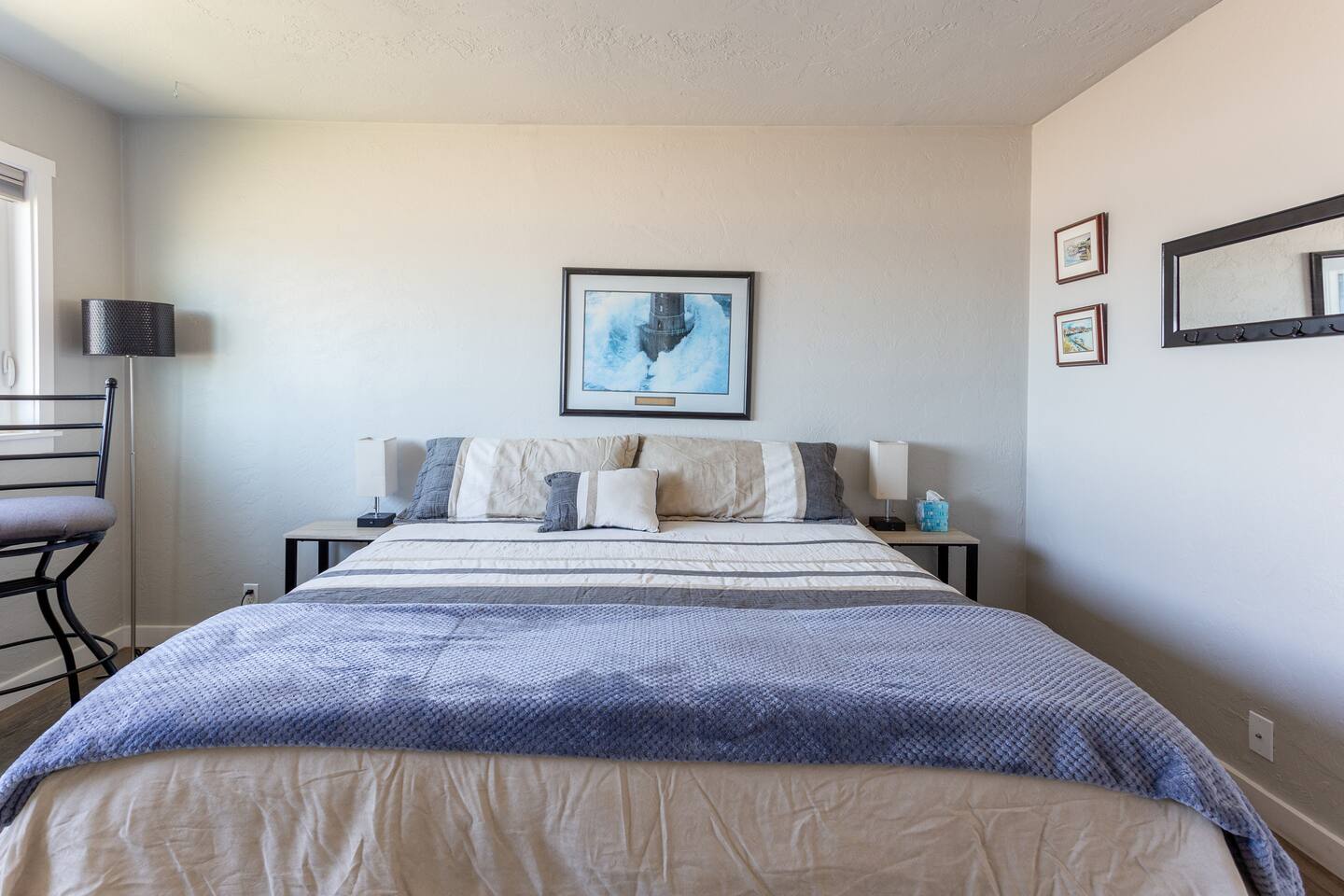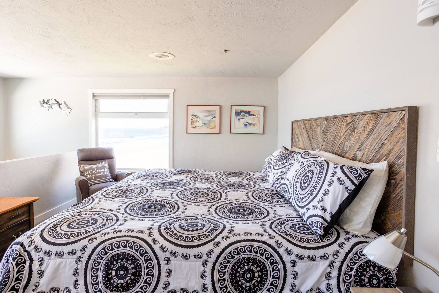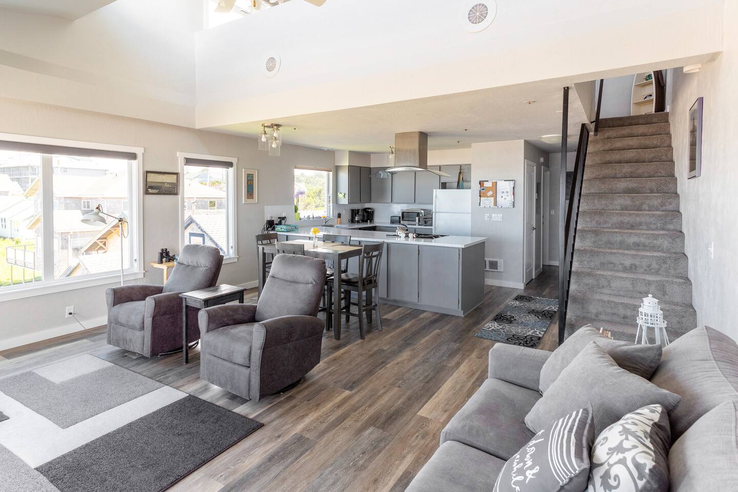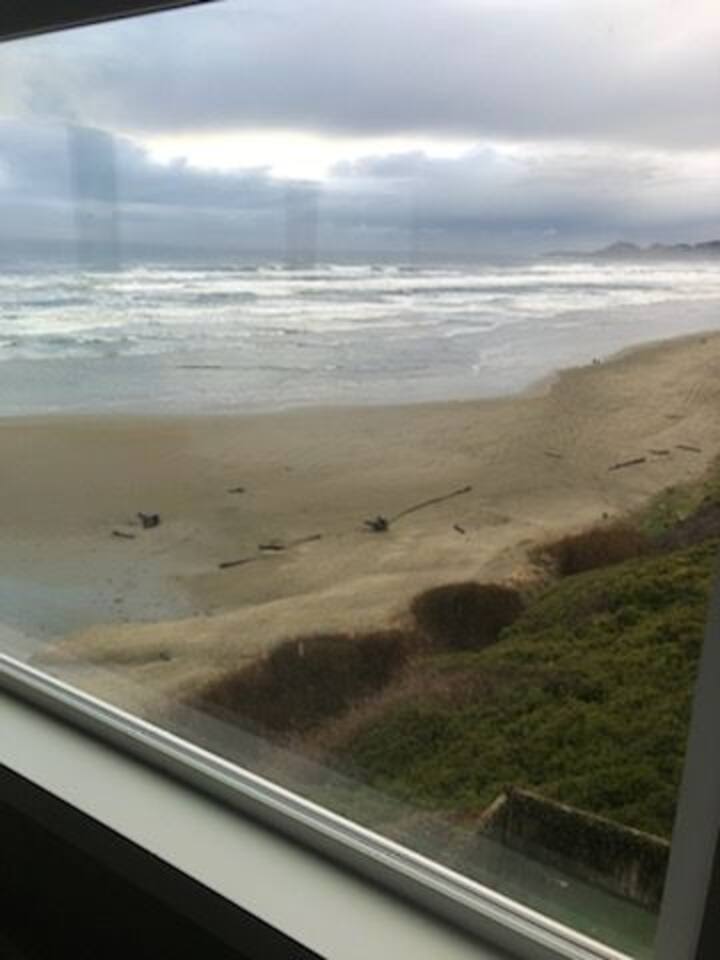 You’ll enjoy a newly remodel unit. Comfy living room with a TV with cable and DVD player, along with a CD player in the living room, are available for guest use. Surround sound stereo system, unfortunately the stereo doesn't pic up much at the coast, but you can bring CD's and/or plug your own device in to play your music. Couch and two swivel recliners so you can enjoy the ocean view out the west and north windows. An electric fireplace, a dining area for 4 and a fully equipped open concept kitchen to make eating in a pleasure. Walk out your door to a beach access or stroll down the block to the Nye Beach District, a collection of unique shops and restaurants from a coffee house, bakery to upscale dining. Downstairs bedroom has TV with cable. Bring a good book, or there are plenty of DVD’s and board games for a cozy evening in or storm watching days. Each unit has it's own assigned parking spot, if you need additional parking you can park on the street.
