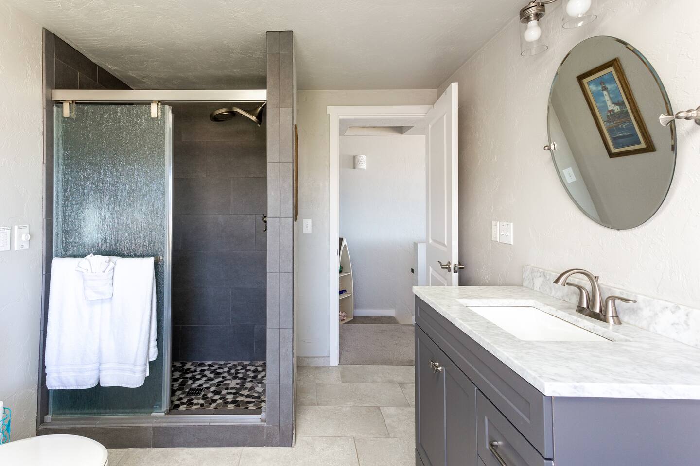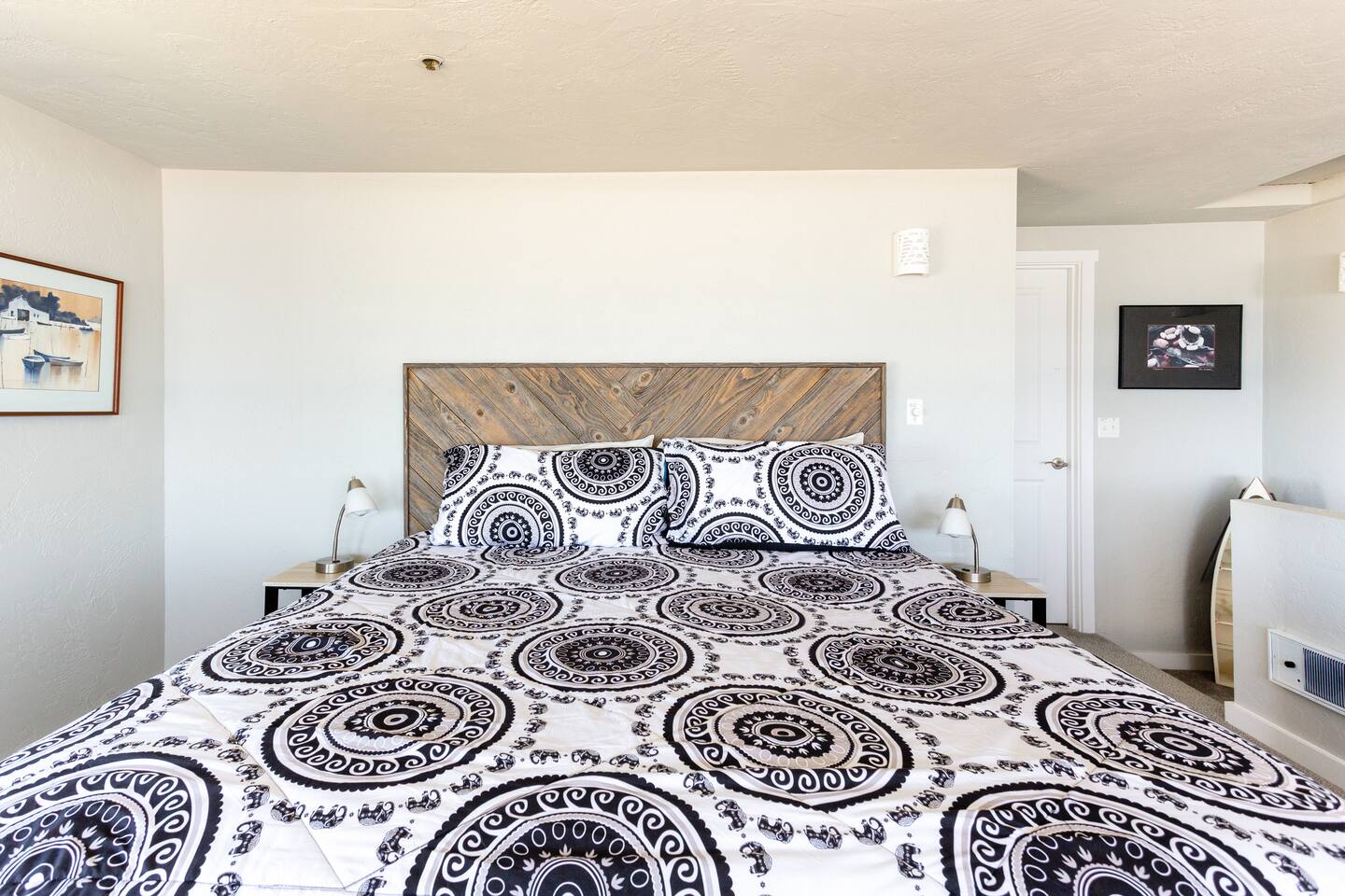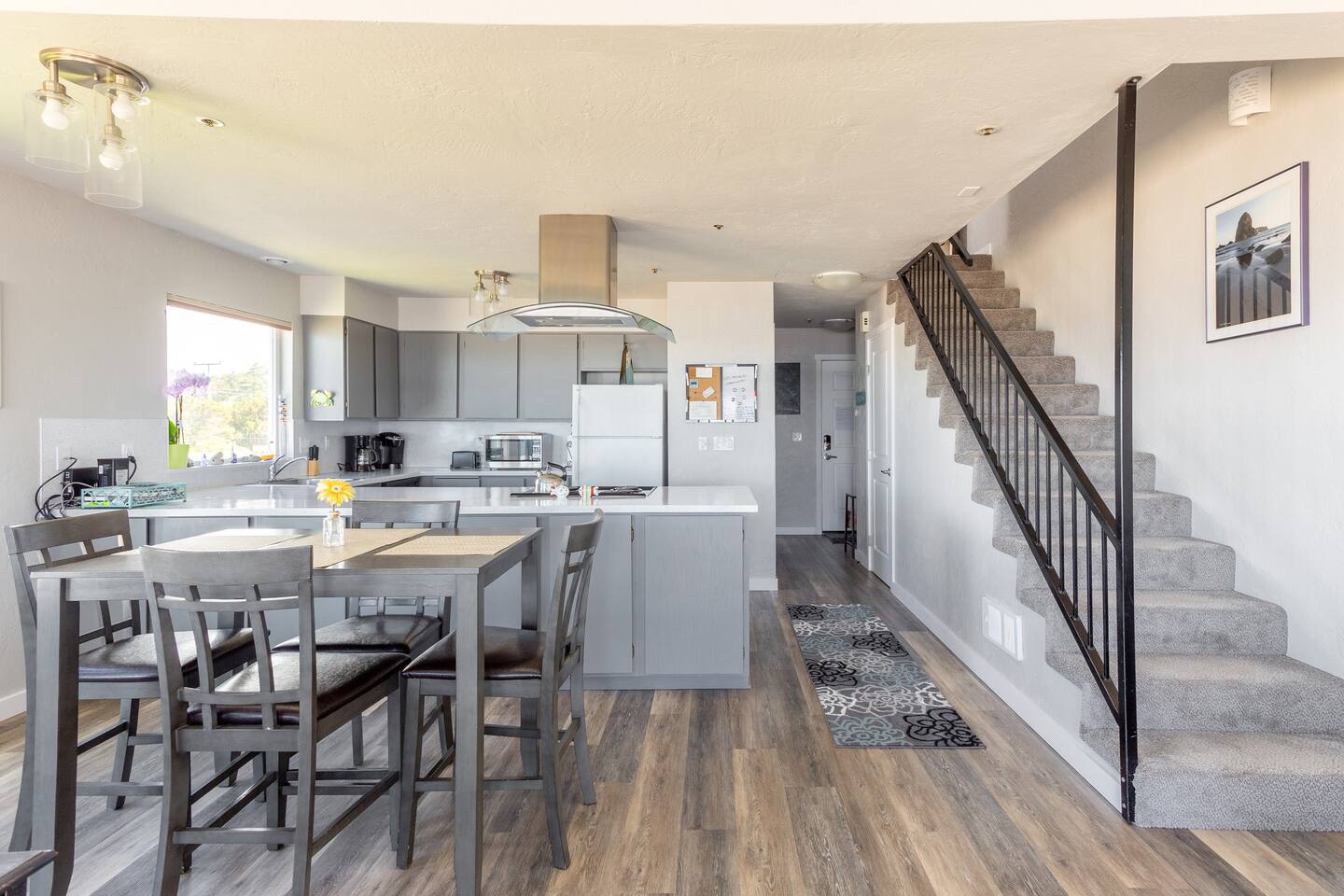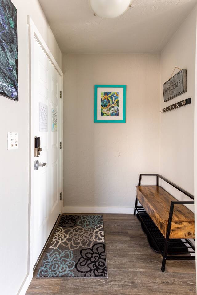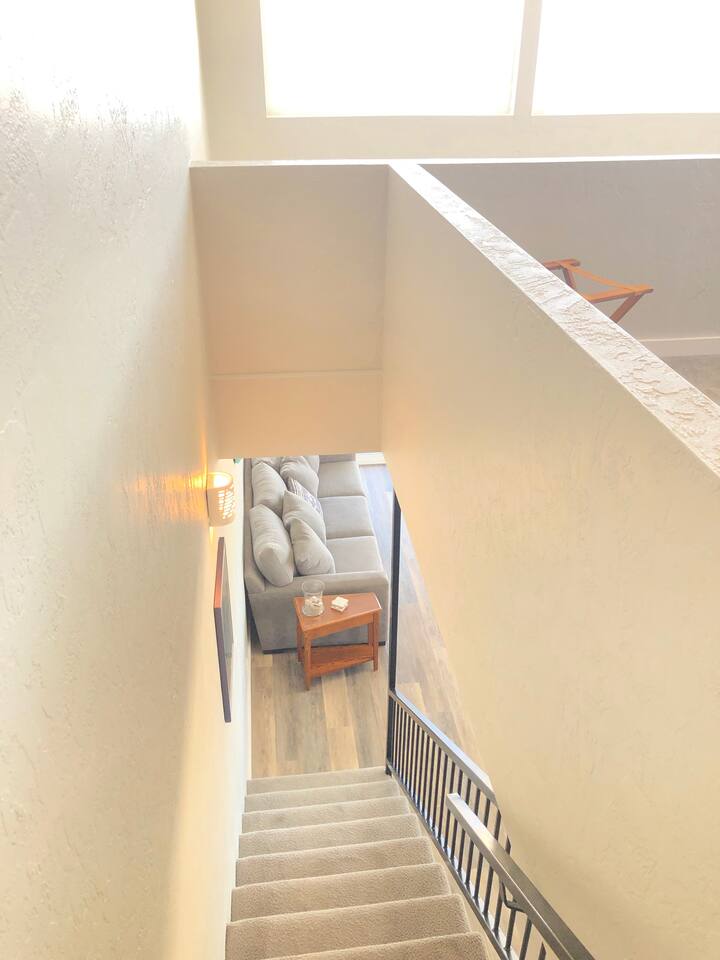 You’ll enjoy a newly remodel unit. Comfy living room with a TV with cable and DVD player, along with a CD player in the living room, are available for guest use. Surround sound stereo system, unfortunately the stereo doesn't pic up much at the coast, but you can bring CD's and/or plug your own device in to play your music. Couch and two swivel recliners so you can enjoy the ocean view out the west and north windows. An electric fireplace, a dining area for 4 and a fully equipped open concept kitchen to make eating in a pleasure. Walk out your door to a beach access or stroll down the block to the Nye Beach District, a collection of unique shops and restaurants from a coffee house, bakery to upscale dining. Downstairs bedroom has TV with cable. Bring a good book, or there are plenty of DVD’s and board games for a cozy evening in or storm watching days. Each unit has it's own assigned parking spot, if you need additional parking you can park on the street.