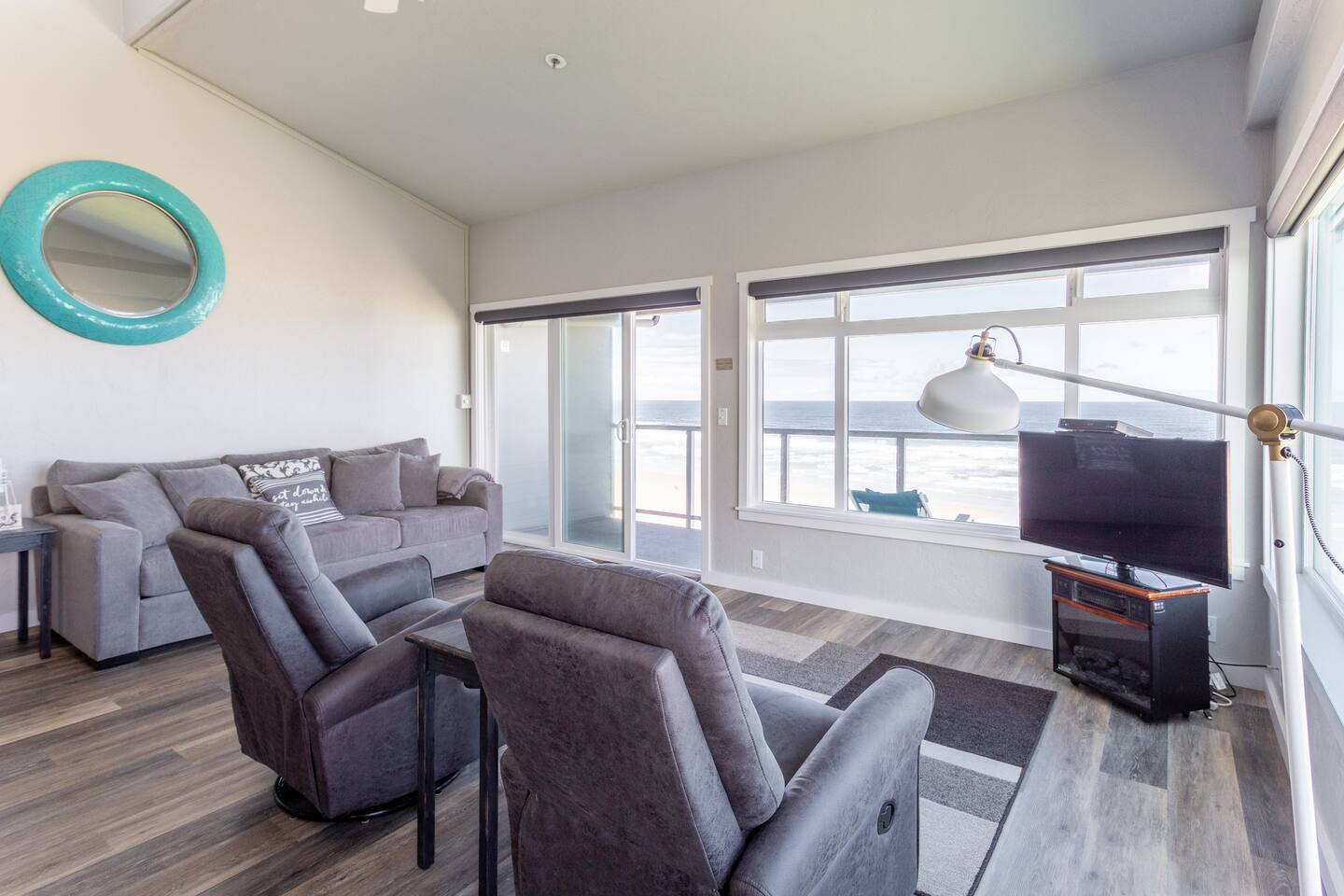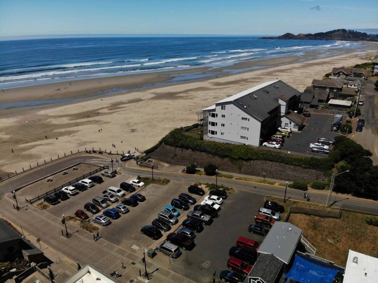 Looking for the perfect mix of comfort, charm, and ocean views? You’ll love this freshly remodeled unit with a cozy living room, Roku TV, DVD player, and CD system with speakers in every room. Lounge on the couch or swivel recliners and take in stunning views from both west and north windows. Enjoy the warmth of a small electric fireplace, dine at the table for four, or cook up your favorites in the open-concept kitchen—complete with a Keurig (pods included!) and full-size coffee maker. Traveling with little ones? We’ve got you covered with a Pack 'n Play, high chair, and baby gate—all ready for your stay. Just steps from your door, stroll across the lot to direct beach access or head down the block to the Nye Beach District, full of charming coffee shops, local pubs, pizza, and upscale dining. The downstairs bedroom includes a Roku TV, and you’ll find DVDs and board games for cozy stormy nights or lazy afternoons. Planning a romantic escape? This condo is made for it—soak in the ocean-view Jacuzzi tub for two with a view of Yaquina Head Lighthouse. Enjoy miles of sandy beach for long walks and seaside adventures. Whether it’s a spring retreat, summer vacation, crisp fall getaway, or winter storm-watching escape—you’ll feel right at home. There’s so much to explore in Newport! Visit the Oregon Coast Aquarium, stroll the Bayfront, tour the Hatfield Marine Science Center, or set off on a whale watching or deep sea fishing trip. For more adventure, take a scenic 30-minute drive to Lincoln City for concerts, great dining, and a little pampering at the Salishan Spa or Chinook Winds Casino & Golf Resort. This condo includes parking for one vehicle; additional parking is available on the street. Please note that boats, trailers, and RVs are not permitted due to space limitations. You’ll also find 16-hour public parking nearby at the Newport Turnaround. Due to severe allergies, this condo is not pet-friendly. It’s hard to beat the stunning views, easy beach access, and walkable location of this oceanfront retreat—come see why guests return year after year! Book for a vacation to remember! THINGS TO DO & PLACES TO VISIT: The Oregon Coast Aquarium Yaquina Head Interpretive Center Yaquina Head and Bay Lighthouses Historic Bayfront Historic Nye Beach Hatfield Marine Science Center Lincoln County Museums Vietnam Memorial Park Veteran's Memorial Commemorative Walk at Don Davis Park Visual Arts Center Yaquina Art Center Performing Arts Center Pacific Maritime Museum OUTDOOR ACTIVITIES: Public Golf Course Picnic Areas Bicycling & Hiking Sailing, Surfing & Diving Fishing, Crabbing & Clamming Wildlife Viewing, Bird & Storm Watching Camping Miles of beautiful sand beaches for kite flying, beach combing, bonfires, and the most beautiful sunset on Nye Beach ANNUAL EVENTS: Newport Seafood & Wine Festival (Feb) Coast Hills Classic Mountain Bike Race (May) Loyalty Days & Seafair Festival (May) Saturday Farmer's Market (Year-round) Newport Marathon (June) Fireworks over the Bay (July) Lincoln County Fair (July) Quilt Show (Aug) Newport Cider Festival (Oct) Oregon Coast Jazz Party (Oct) The Seas of Light & Lighted Boat Parade (Dec)